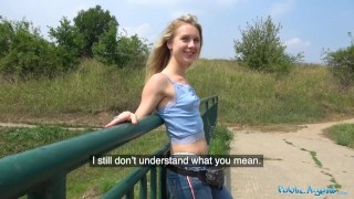 Public Agent Horny blondes tight body fucked for cash in forest